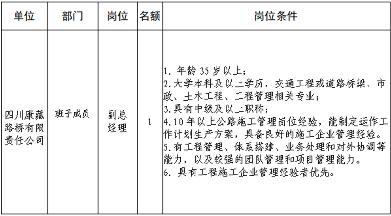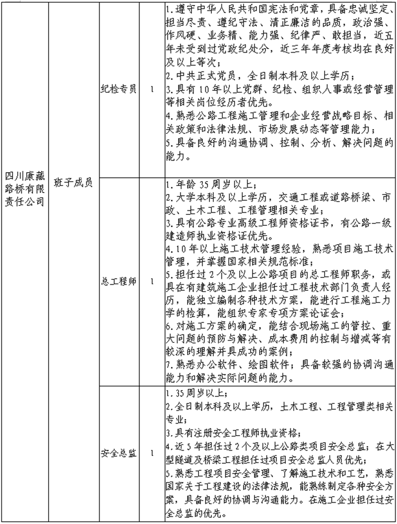根據(jù)發(fā)展需要,決定面向社會公開招聘雅安市交通建設(shè)(集團)有限責(zé)任公司(以下簡稱“雅安交建集團”)所屬子公司班子成員4名,現(xiàn)將有關(guān)事項公告如下: