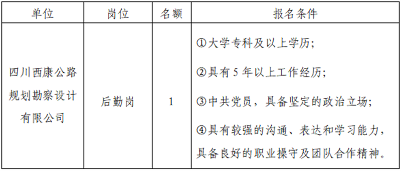 根據(jù)發(fā)展需要,決定面向社會(huì)公開招聘雅安市交通建設(shè)(集團(tuán))有限責(zé)任公司(以下簡稱“雅安交建集團(tuán)”)所屬子公司綜合辦公室后勤崗1名,現(xiàn)將有關(guān)事項(xiàng)公告如下: