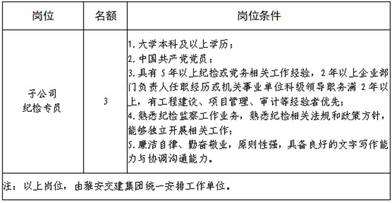 根據(jù)發(fā)展需要,決定面向社會(huì)公開招聘雅安市交通建設(shè)(集團(tuán))有限責(zé)任公司(以下簡(jiǎn)稱“雅安交建集團(tuán)”)所屬子公司紀(jì)檢專員3名,現(xiàn)將有關(guān)事項(xiàng)公告如下: