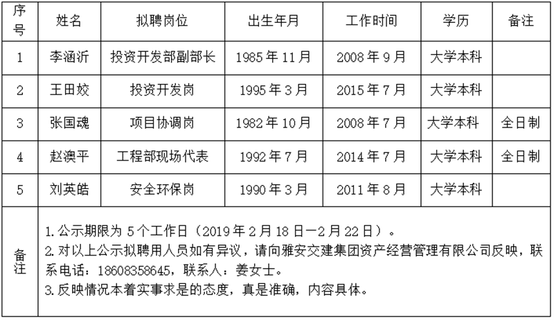雅安交建集團資產(chǎn)經(jīng)營管理有限公司擬聘用人員公示