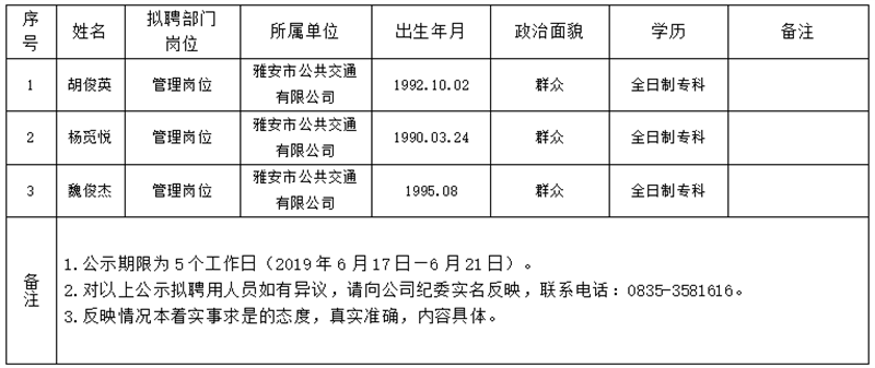 雅安交建集團子公司擬聘用人員公示(公交公司)