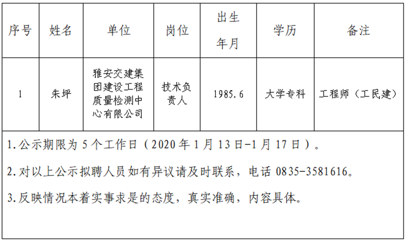 雅安交建集團子公司擬聘用人員公示 (工程檢測中心)
