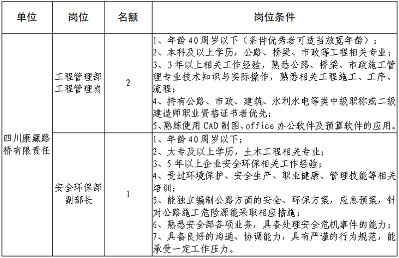 根據(jù)發(fā)展需要,決定面向社會公開招聘雅安市交通建設(集團)有限責任公司(以下簡稱“雅安交建集團”)所屬子公司相關(guān)人員3名,現(xiàn)將有關(guān)事項公告如下: