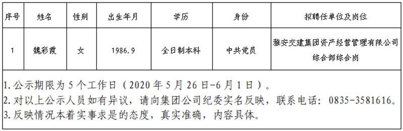 根據(jù)雅安市交通建設(shè)(集團)有限責(zé)任公司招聘公告,經(jīng)公開報名、資格初審、筆試、面試、體檢考察等環(huán)節(jié),現(xiàn)將以下1名擬聘用人員予以公示: