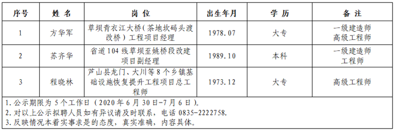 雅安市交通建設(shè)(集團)有限責任公司擬聘用人員公示(項目管理公司人才引進)