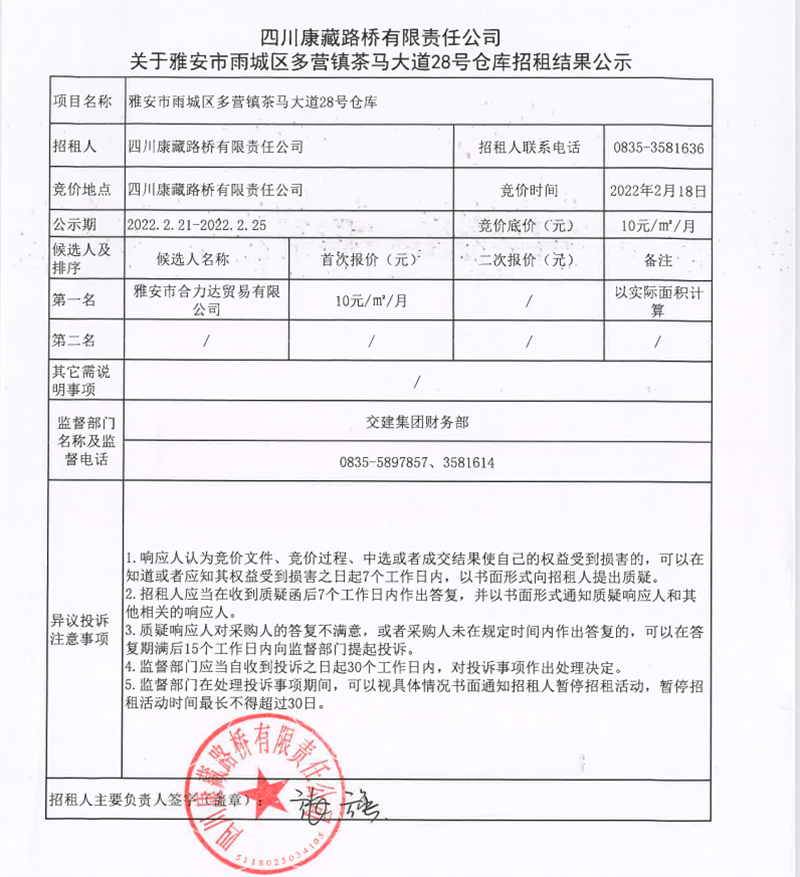 四川康藏路橋有限責(zé)任公司關(guān)于雅安市雨城區(qū)多營(yíng)鎮(zhèn)茶馬大道28號(hào)倉(cāng)庫(kù)招租結(jié)果的公示