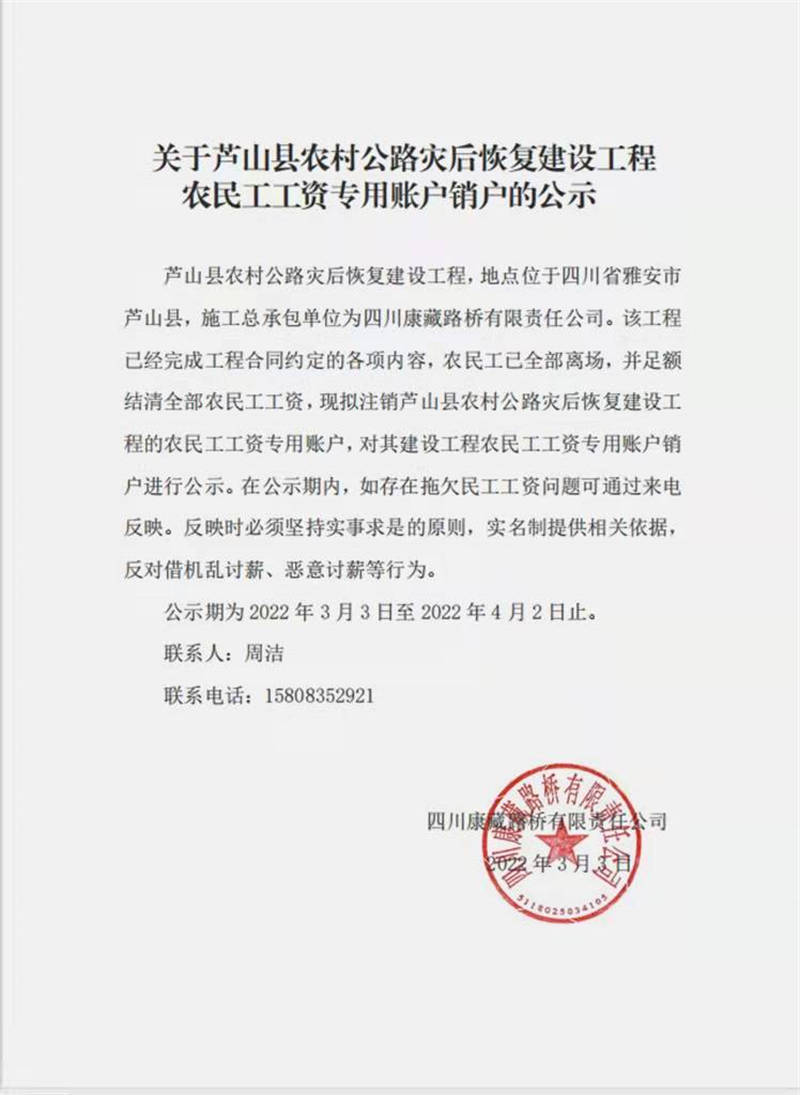 關(guān)于蘆山縣農(nóng)村公路災(zāi)后恢復(fù)建設(shè)工程 農(nóng)民工工資專(zhuān)用賬戶銷(xiāo)戶的公示