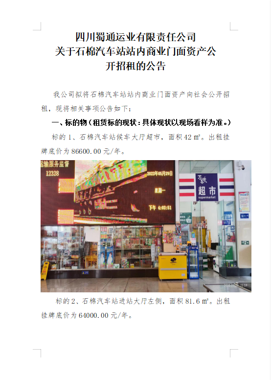 四川蜀通運(yùn)業(yè)有限責(zé)任公司關(guān)于石棉汽車(chē)站站內(nèi)商業(yè)門(mén)面資產(chǎn)公開(kāi)招租的公告