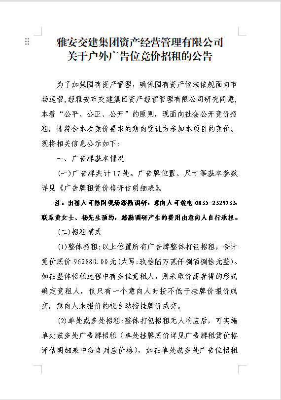 雅安交建集團資產(chǎn)經(jīng)營管理有限公司關(guān)于戶外廣告位競價招租的公告附件