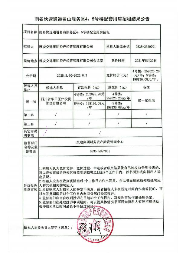 雨名快速通道名山服務(wù)區(qū)4、5號樓配套用房招租結(jié)果公告