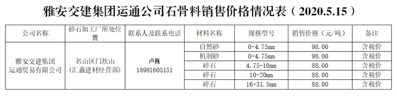 運(yùn)通貿(mào)易有限公司。運(yùn)通公司是雅安市交通建設(shè)(集團(tuán))有限責(zé)任公司獨(dú)資子公司,主要負(fù)責(zé)雨城區(qū)中心城區(qū)河道外砂石經(jīng)營(yíng)管理工作。目前,公司與名山區(qū)匯鑫建材經(jīng)營(yíng)部確定了代加工合作關(guān)系,已投產(chǎn),預(yù)計(jì)年生產(chǎn)能力約30萬(wàn)噸。