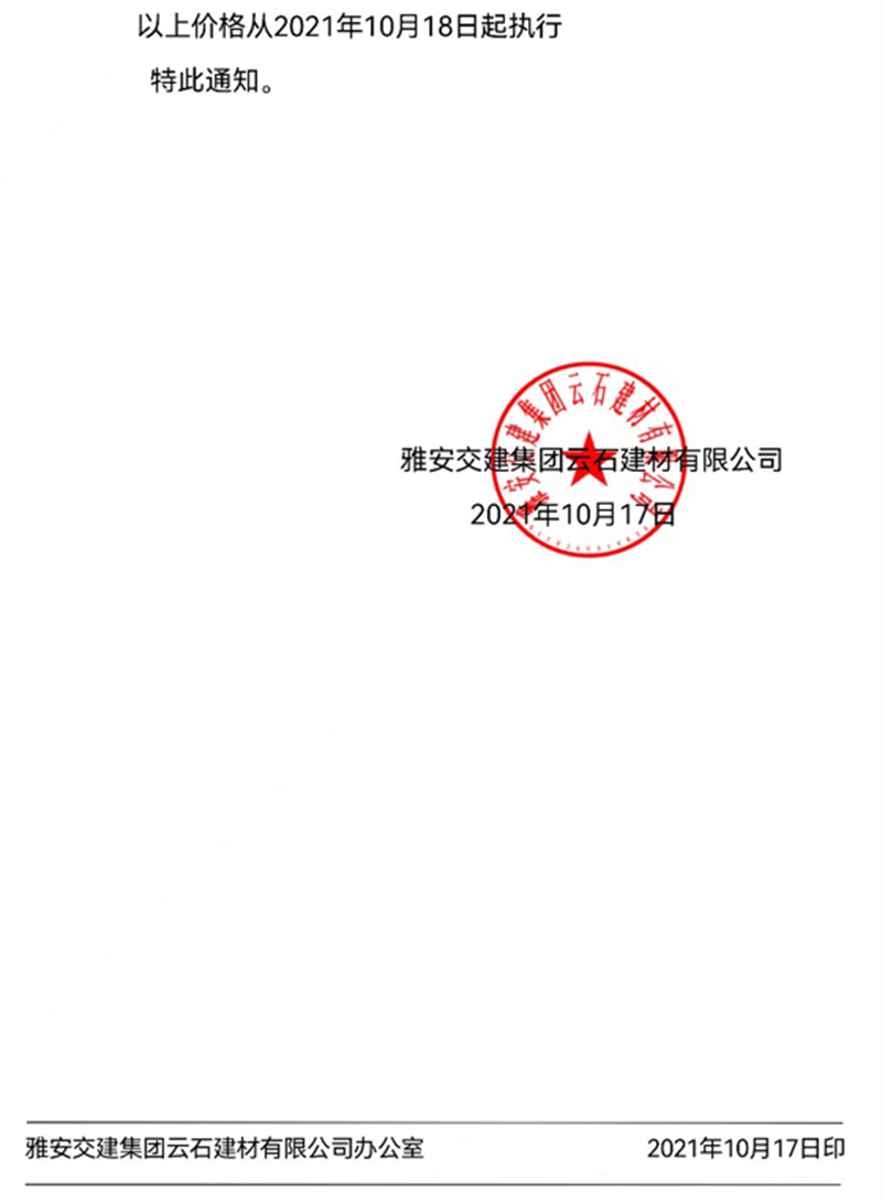 ÑŰ²½»½¨¼¯ˆFÔÆÊ¯¹«Ë¾êP(gu¨¡n)ÓÚÕ{(di¨¤o)Õû³ÉÆ·ÁÏäNÊÛƒr¸ñµÄ֪ͨ£¨2021.10.17£©