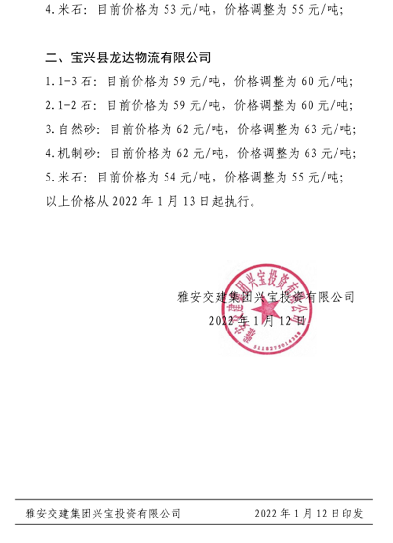 雅安交建集團丹石公司關(guān)于調(diào)整砂石成品骨料銷售價格的通知(2022.1.5)