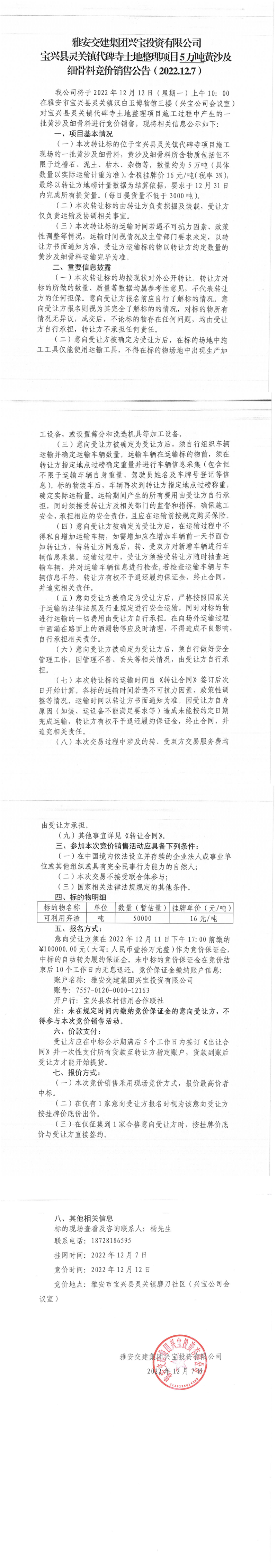 雅安交建集團(tuán)興寶投資有限公司寶興縣靈關(guān)鎮(zhèn)代碑寺土地整理項(xiàng)目一批黃沙及細(xì)骨料競價(jià)銷售掛網(wǎng)公告2022.12.7