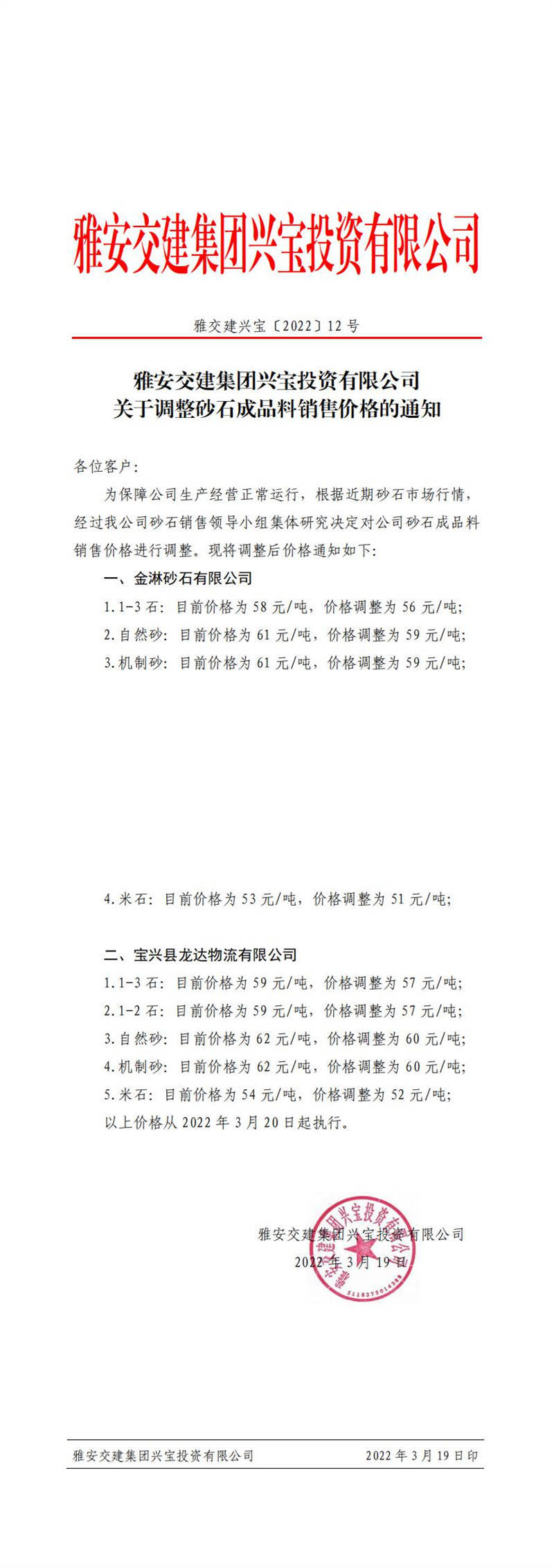 雅安交建興寶公司關(guān)于調(diào)整砂石成品料銷售價格的通知(2022-3-1)