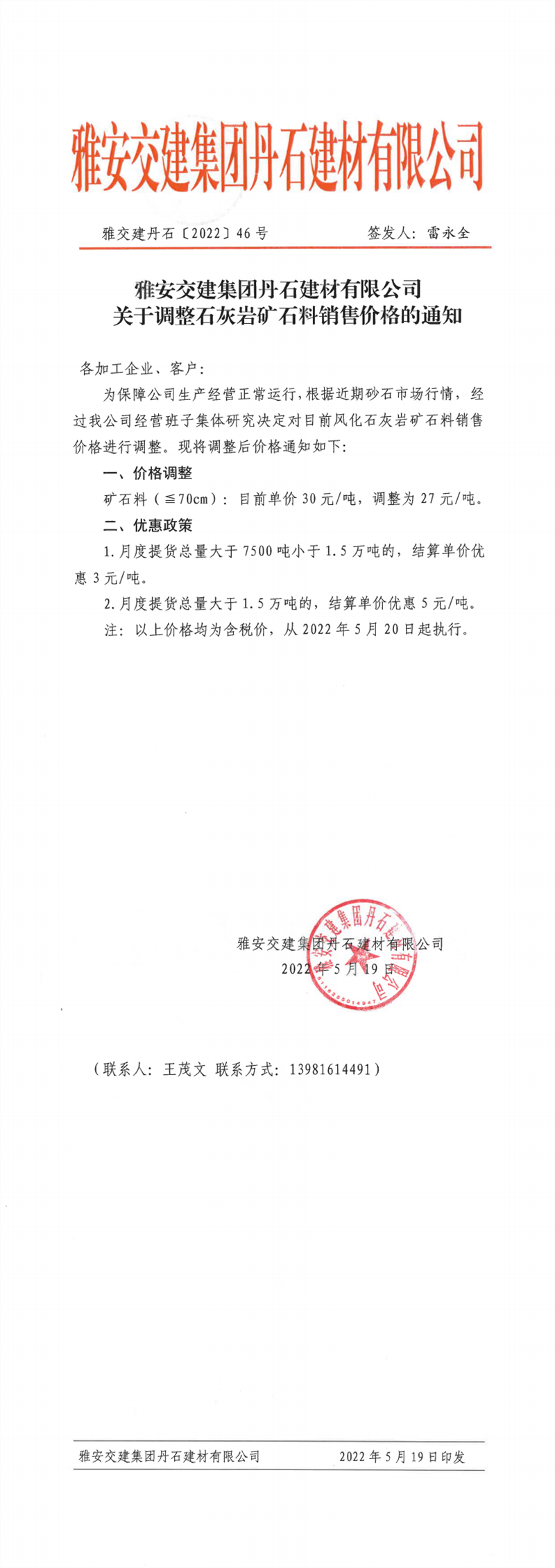 雅安交建集團丹石公司關于調(diào)整石灰?guī)r礦石料價格的通知-2022-5-19