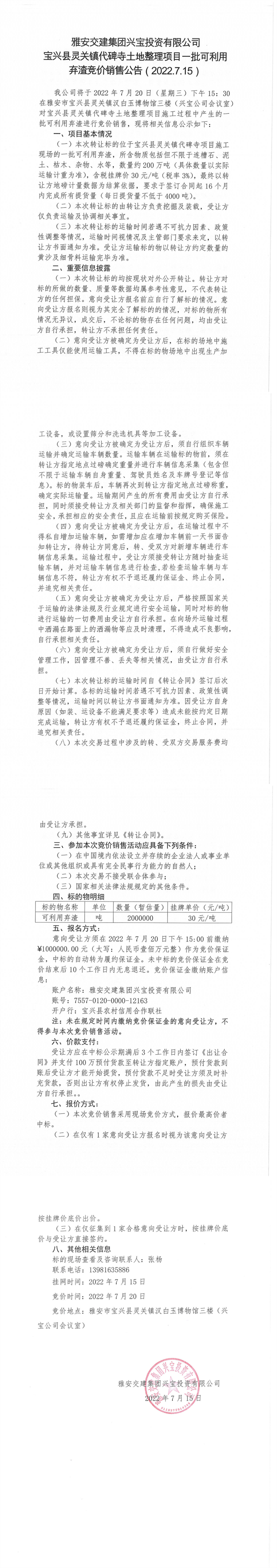 寶興縣靈關(guān)鎮(zhèn)代碑寺土地整理項目一批可利用棄渣競價銷售公告7.15(200萬噸)