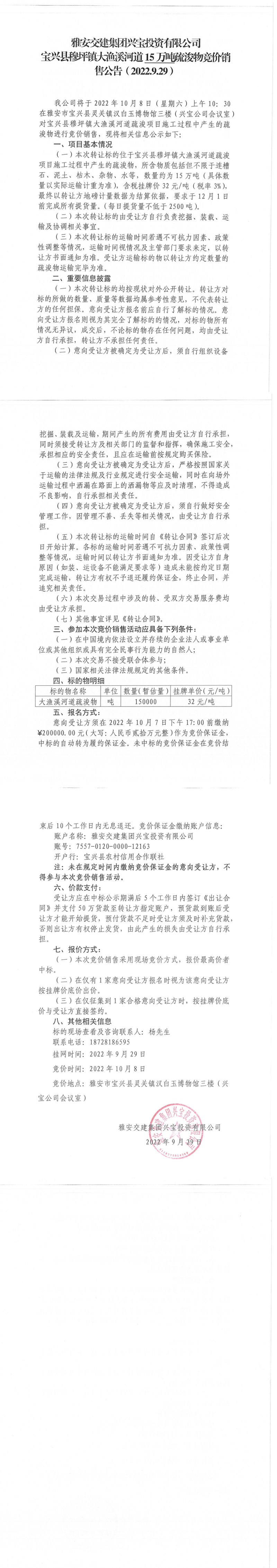 雅安交建集團(tuán)興寶投資有限公司寶興縣穆坪鎮(zhèn)大漁溪河道15萬(wàn)噸疏浚物競(jìng)價(jià)銷售公告(2022.9.29)
