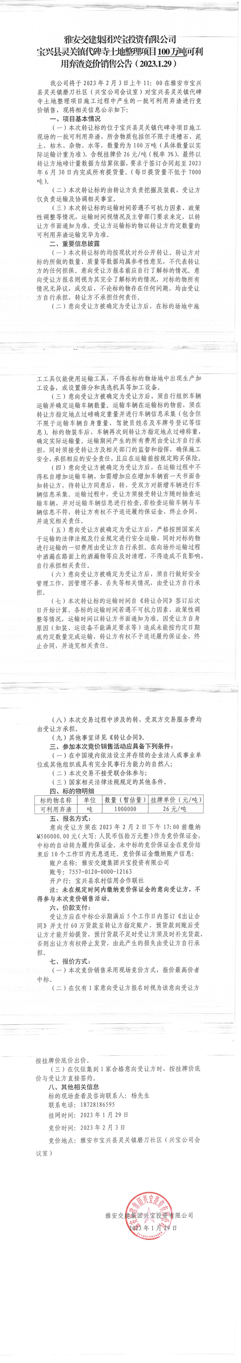 雅安交建集團興寶投資有限公司靈關鎮(zhèn)代碑寺土地整理項目100萬噸可利用棄渣競價銷售公告(2023.1.29)