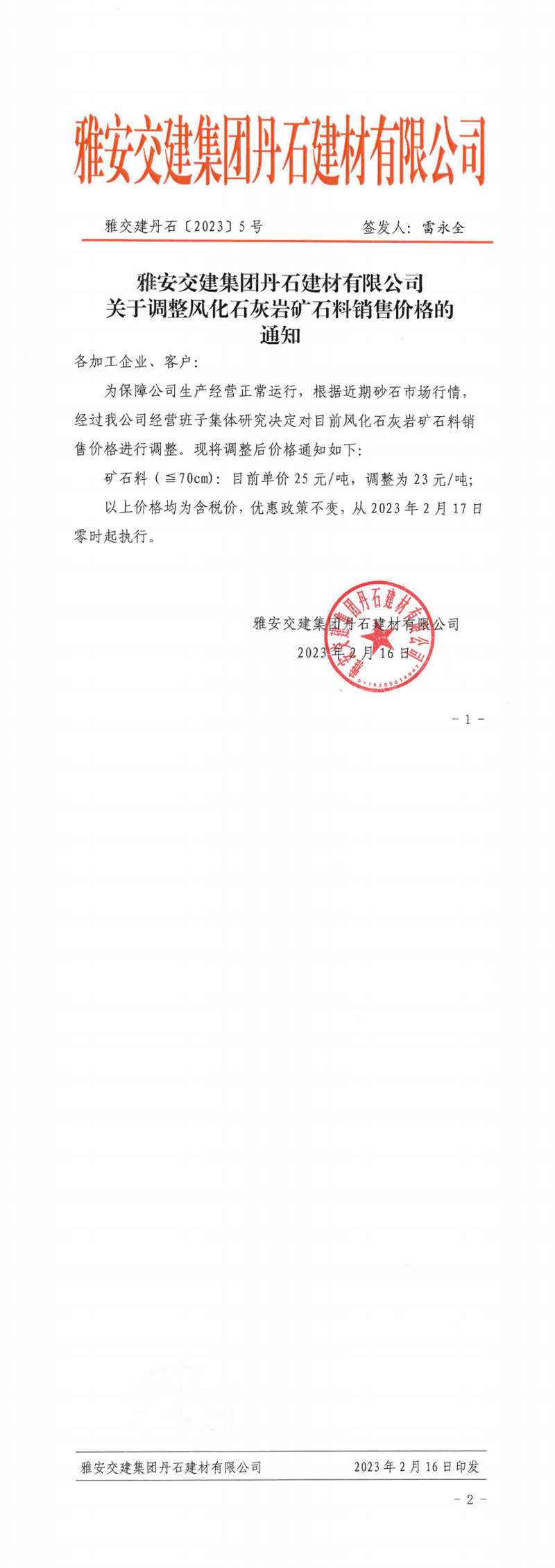 雅交建丹石(2023)5號(hào)調(diào)整風(fēng)化石灰?guī)r礦料銷售價(jià)格的通知(2023.02.16)