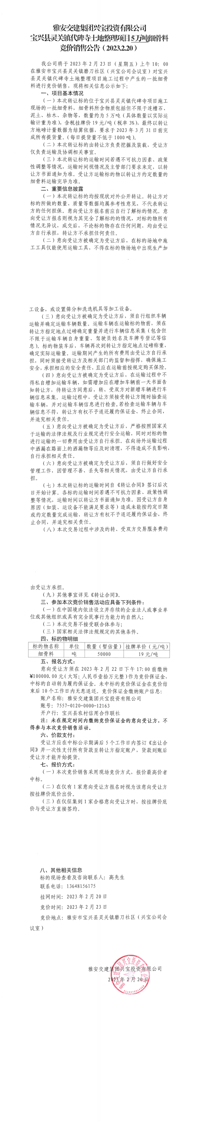 雅安交建集團(tuán)興寶投資有限公司寶興縣靈關(guān)鎮(zhèn)代碑寺土地整理項(xiàng)目5萬(wàn)噸細(xì)骨料競(jìng)價(jià)銷(xiāo)售公告(2023.2.20)